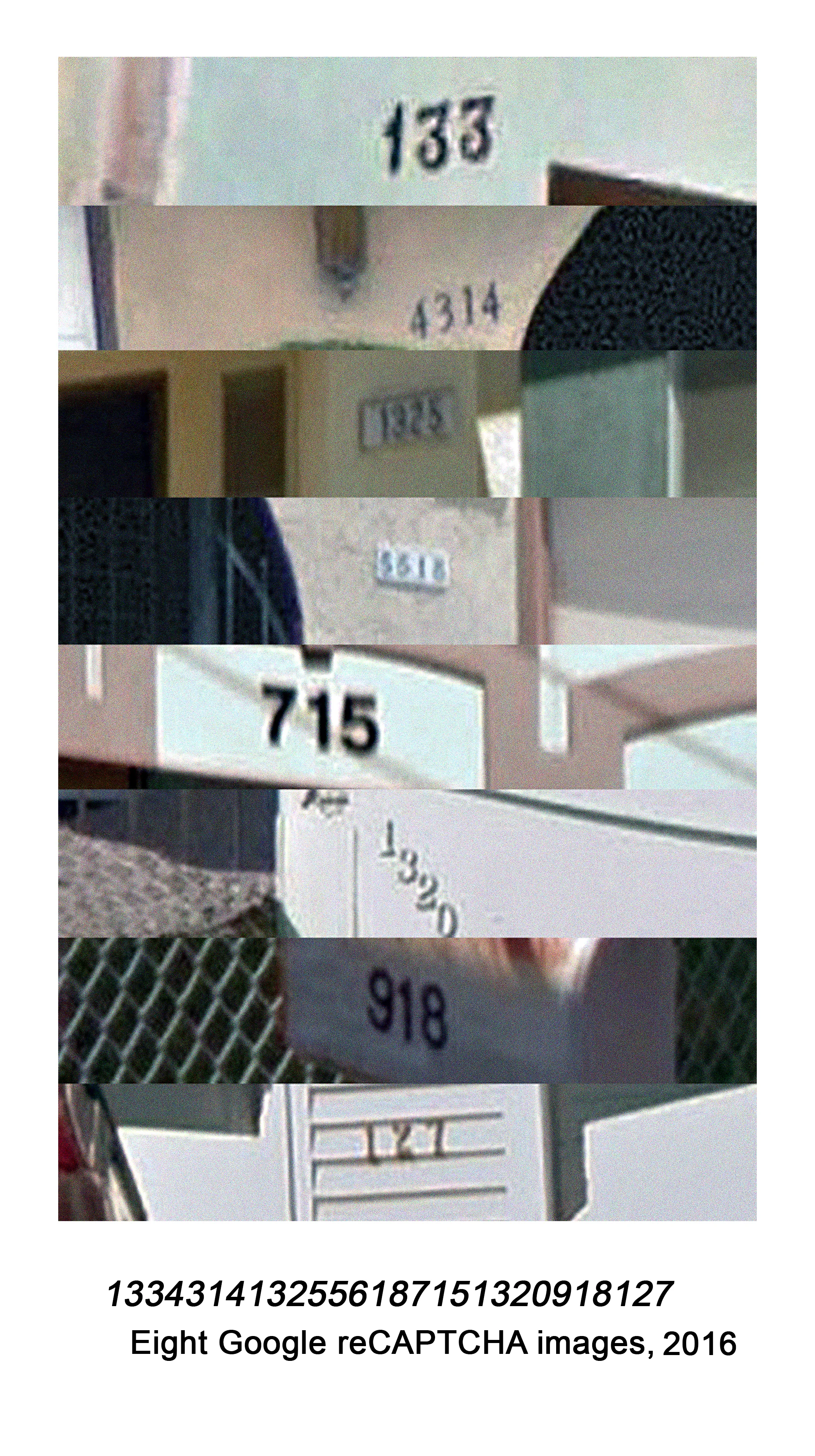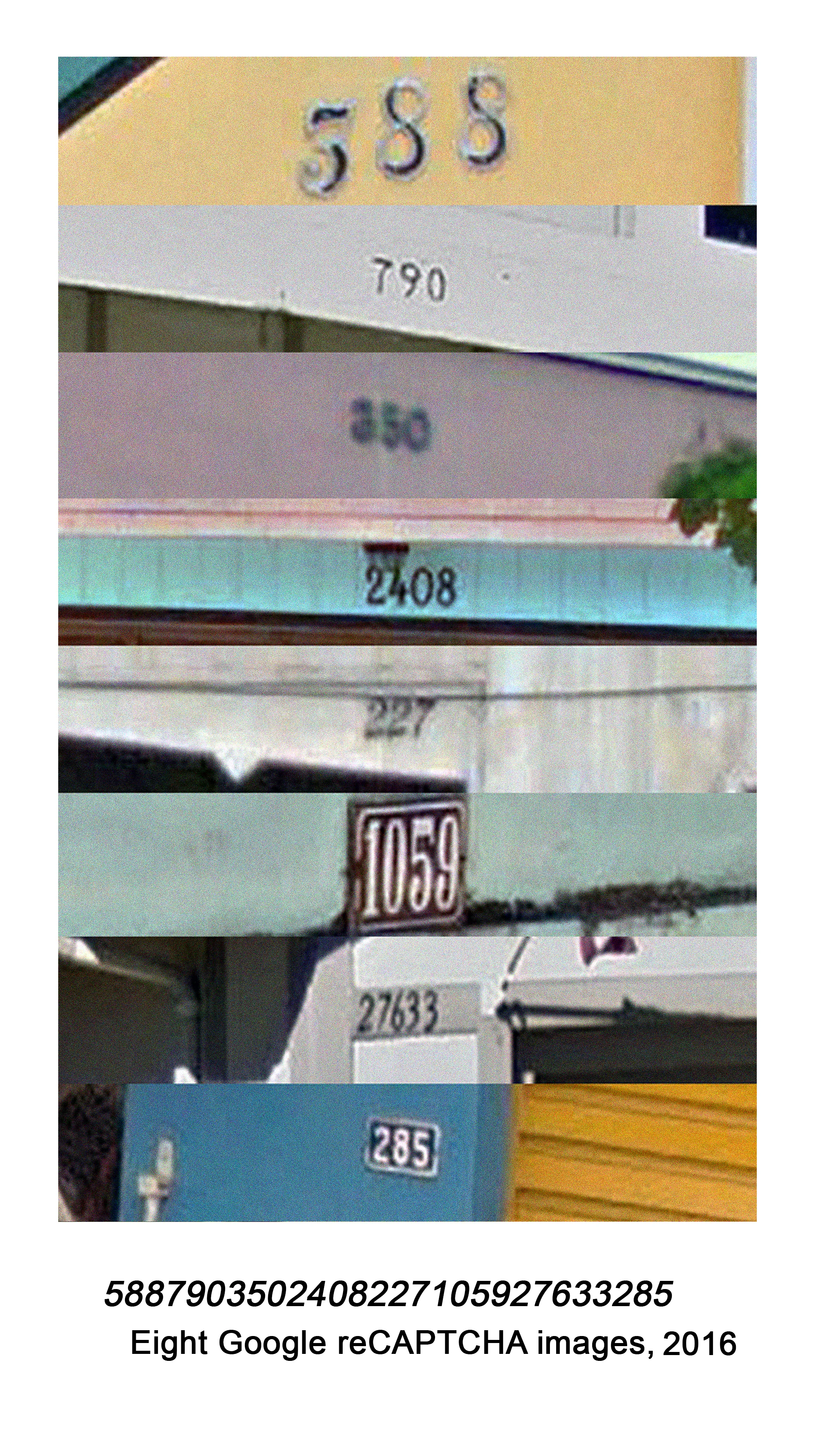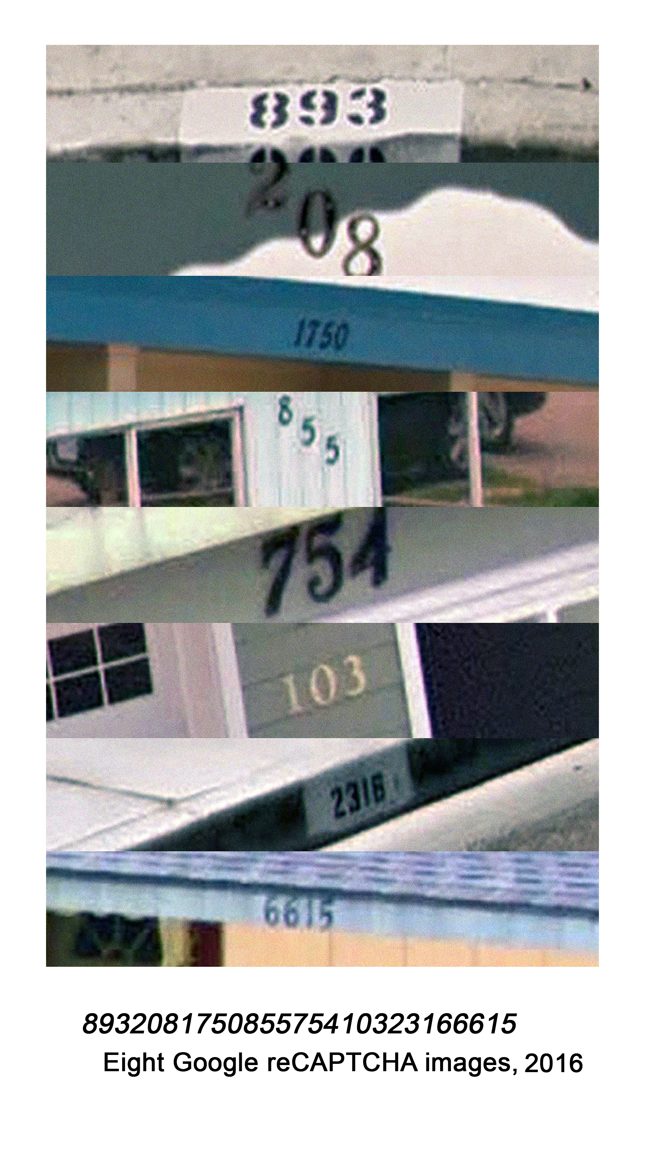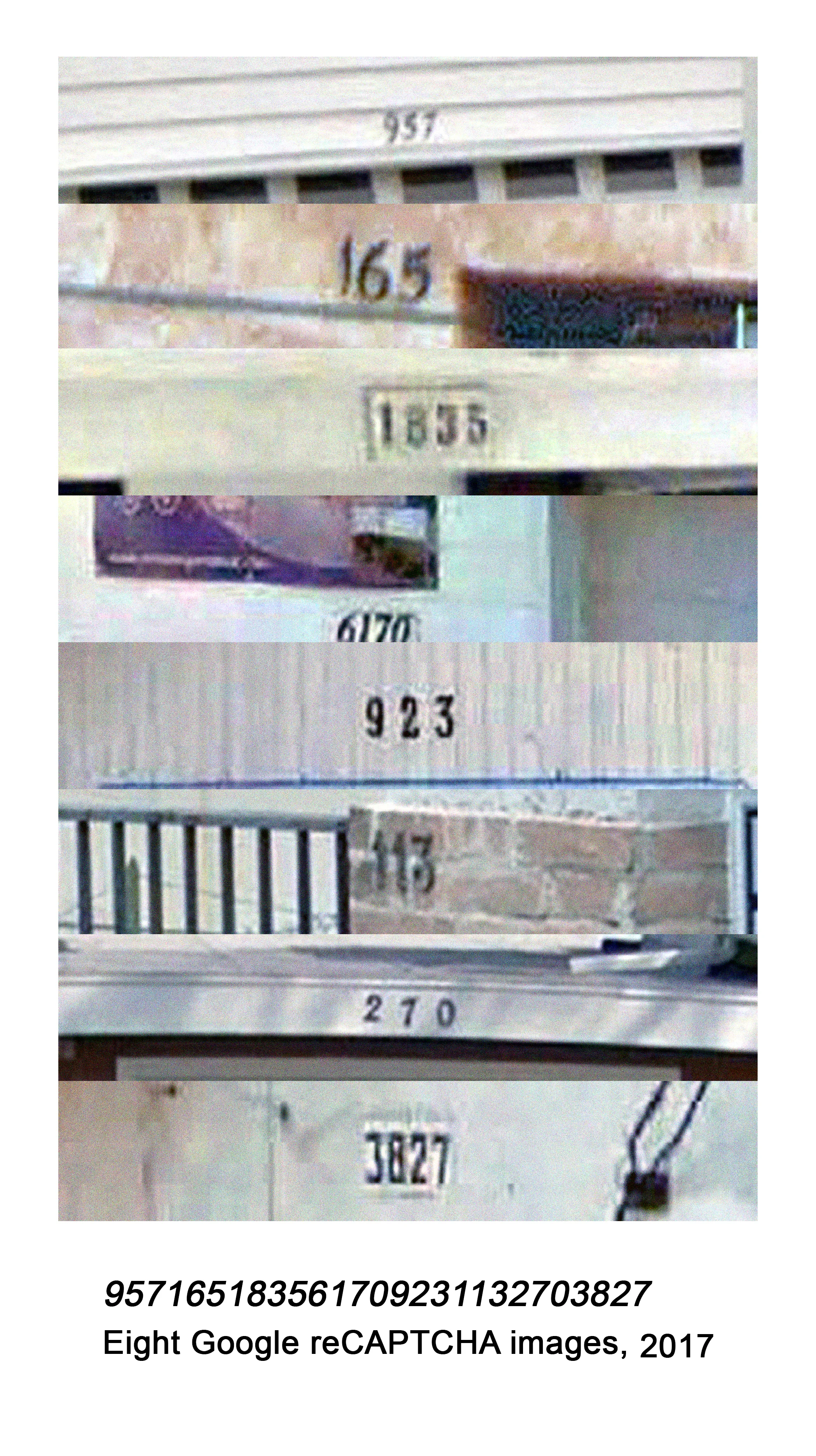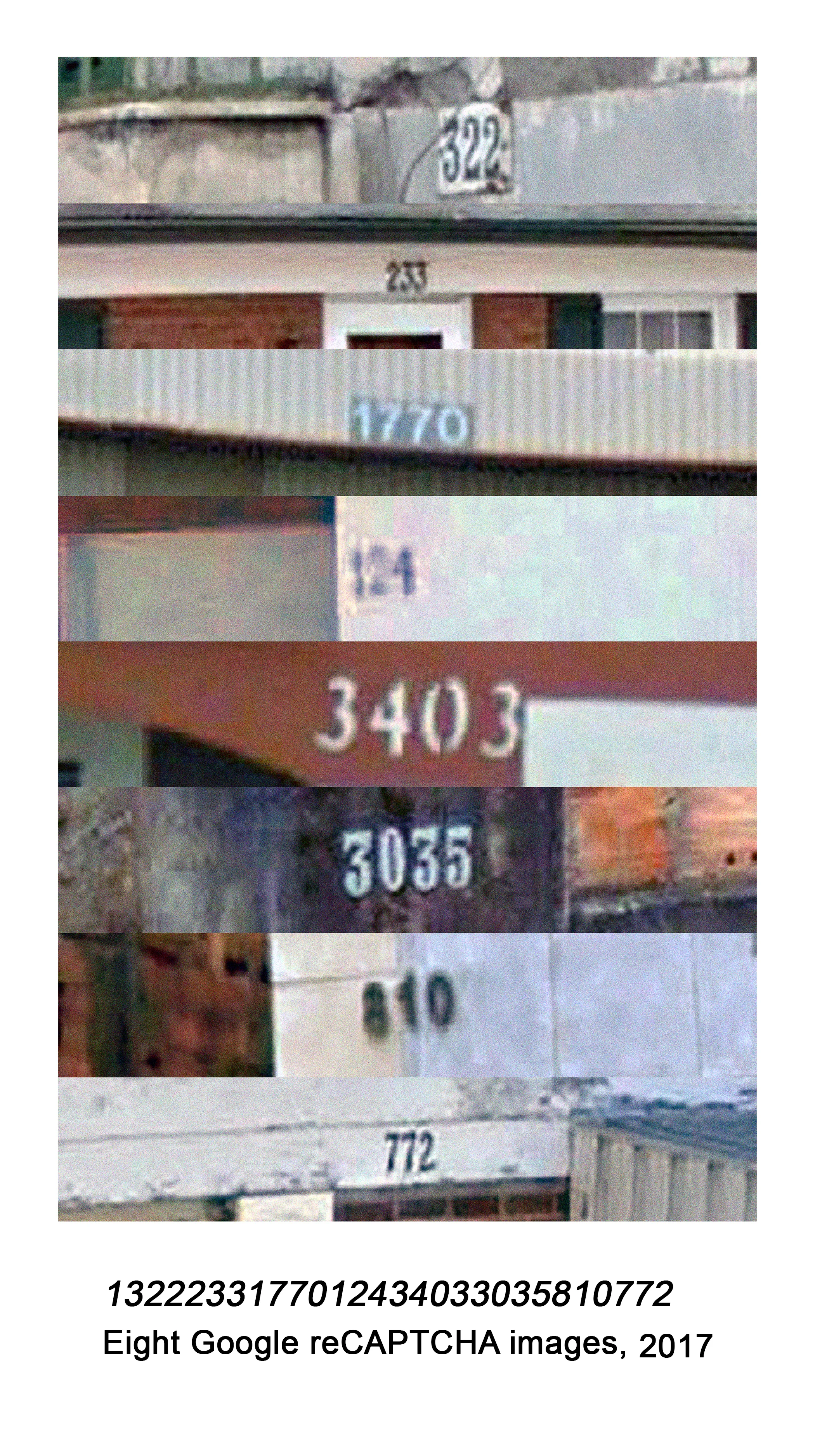 The “reCAPTCHA” system was developed by computer security researchers to prevent bots from exploiting services provided by websites and social media platforms. One usually encountered these tightly cropped, lo-res JPEGs, which were sourced from Google Street View, during the process of creating an online profile. Between May and July of 2016, just prior to an update of the reCAPTCHA system, I had manually downloaded over 2000 reCAPTCHA image files before they all but vanished from the Internet. These ostensibly mundane images performed dual purposes. They functioned concurrently as test challenge pictures in an automated gatekeeping system designed to prevent bots from simulating human agents -- “Prove you’re not a robot” – while also serving as dataset images to develop AI.