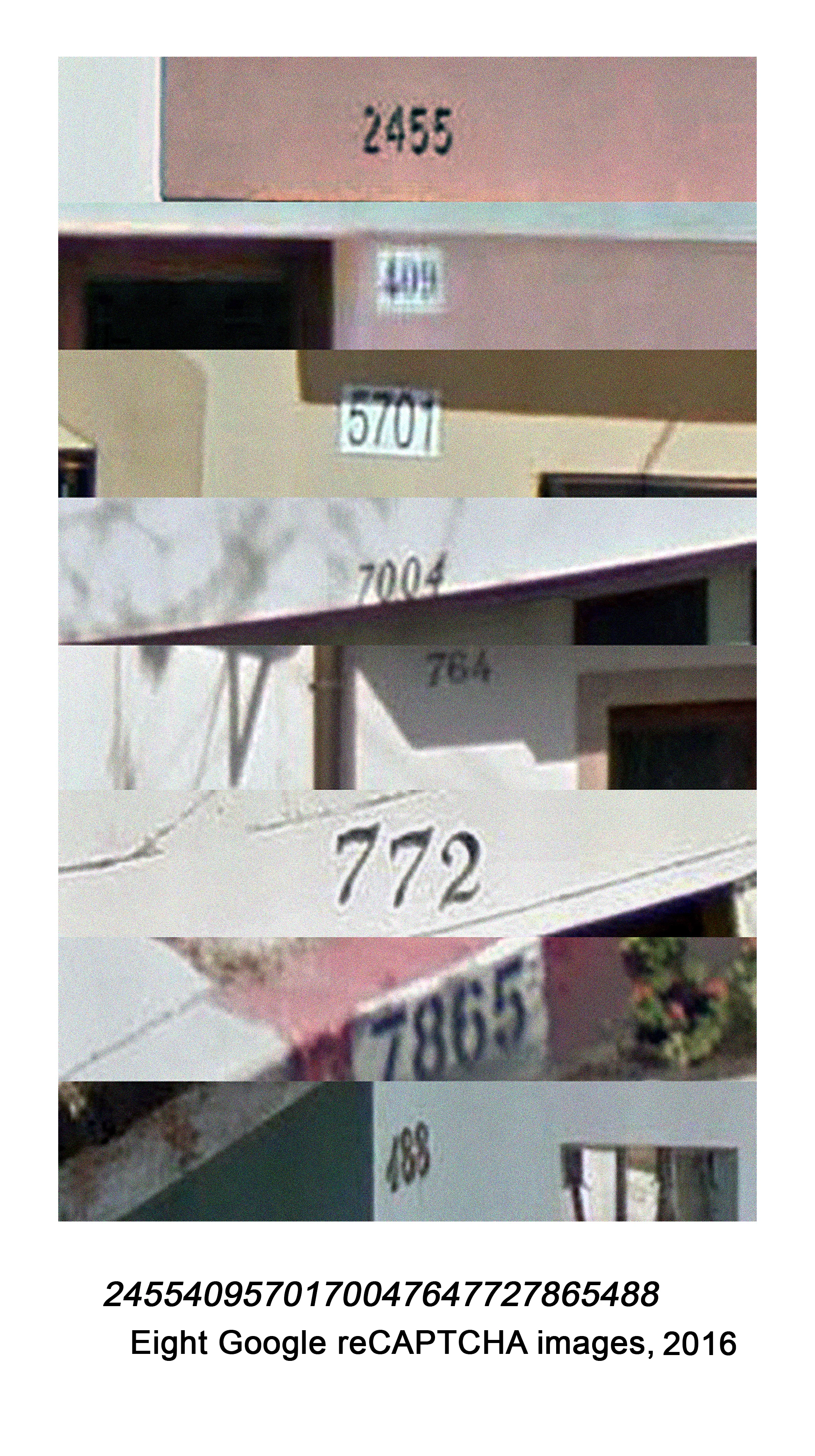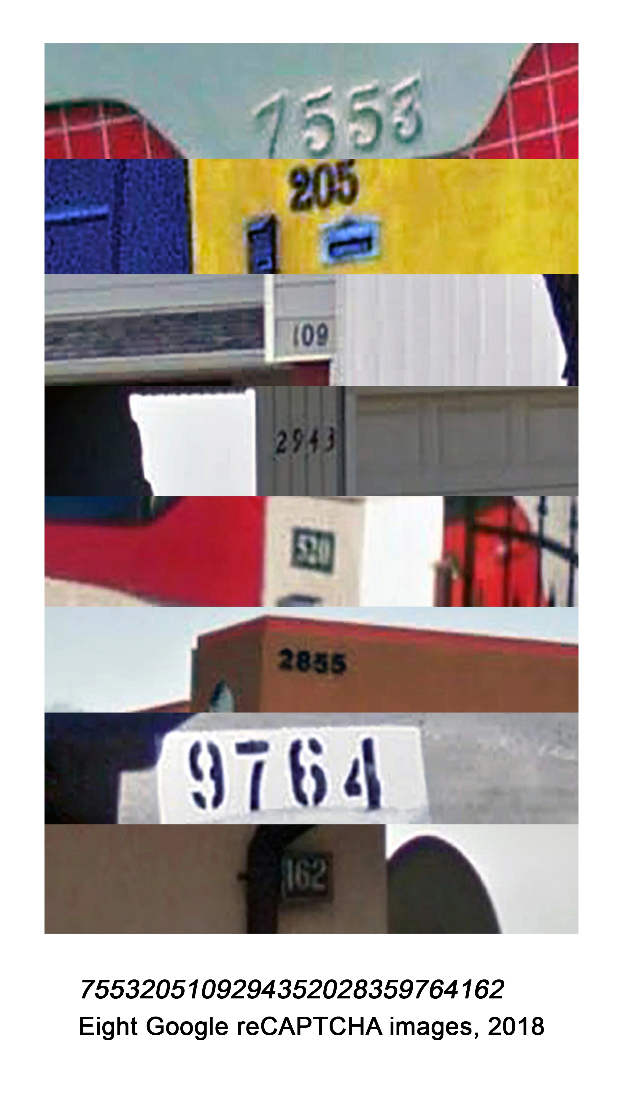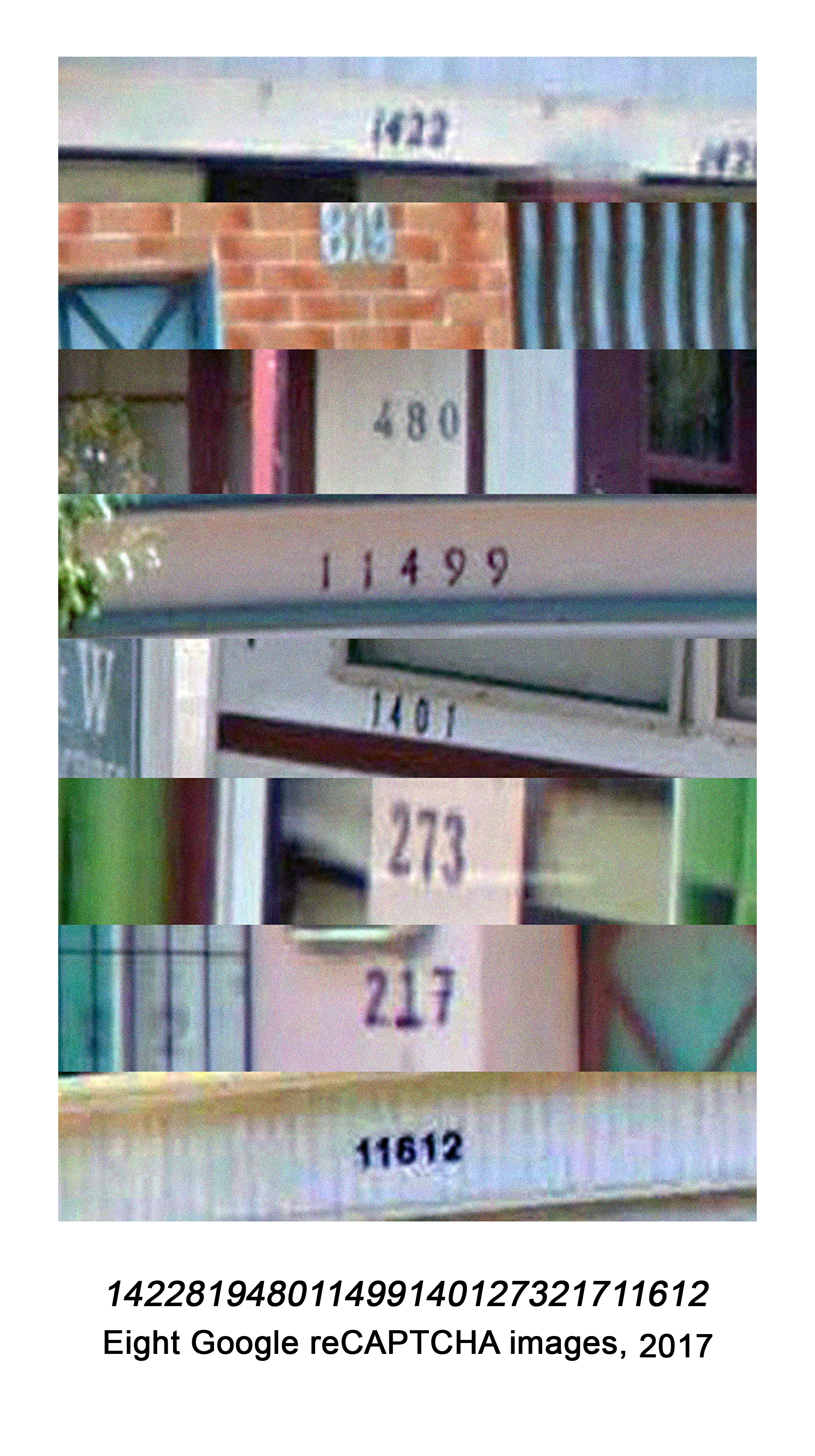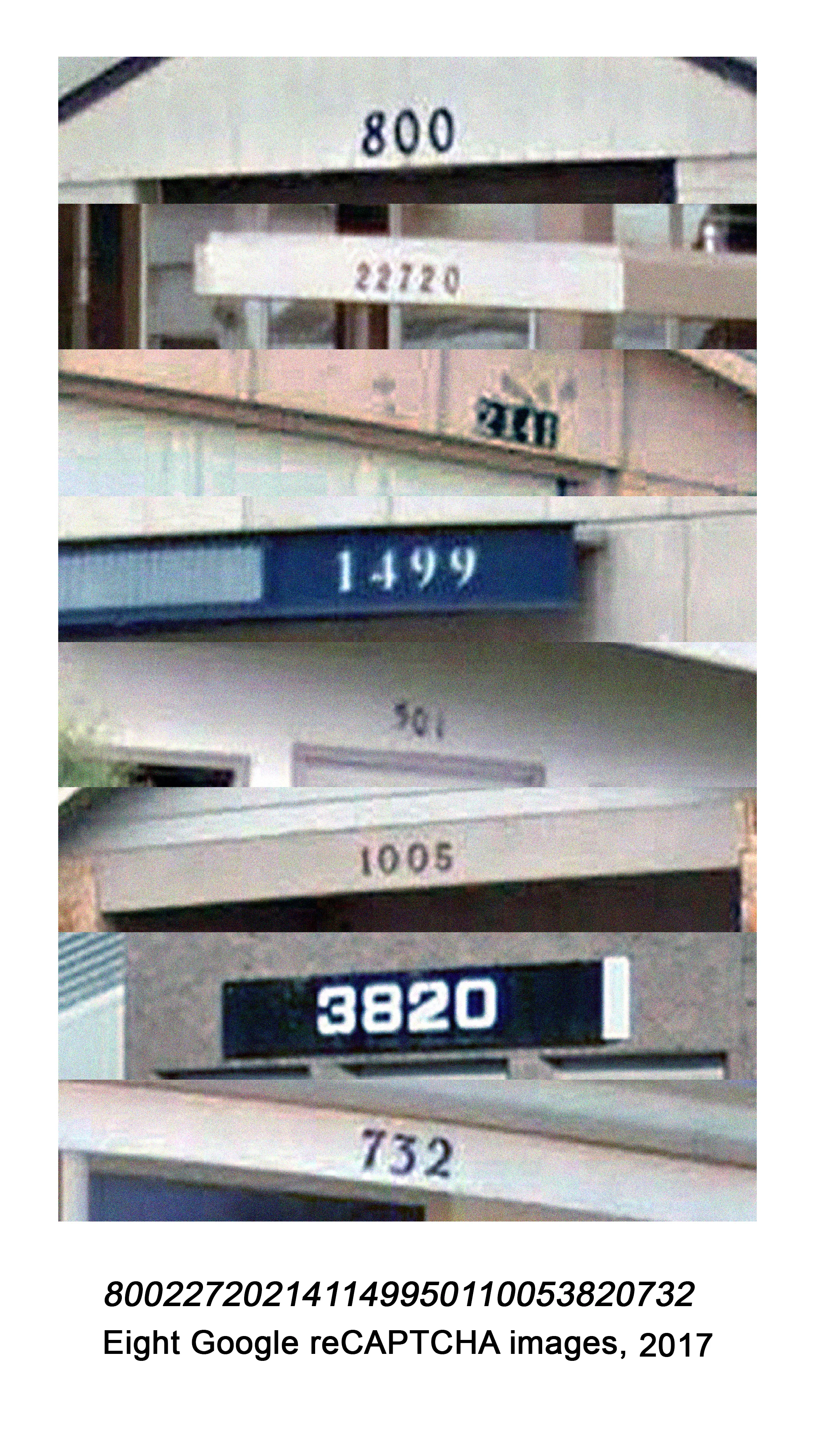 The “reCAPTCHA” system was developed by computer security researchers to prevent bots from exploiting services provided by websites and social media platforms. One usually encountered these tightly cropped, lo-res JPEGs, which were sourced from Google Street View, during the process of creating an online profile. Between May and July of 2016, just prior to an update of the reCAPTCHA system, I had manually downloaded over 2000 reCAPTCHA image files before they all but vanished from the Internet. These ostensibly mundane images performed dual purposes. They functioned concurrently as test challenge pictures in an automated gatekeeping system designed to prevent bots from simulating human agents -- “Prove you’re not a robot” – while also serving as dataset images to develop AI.