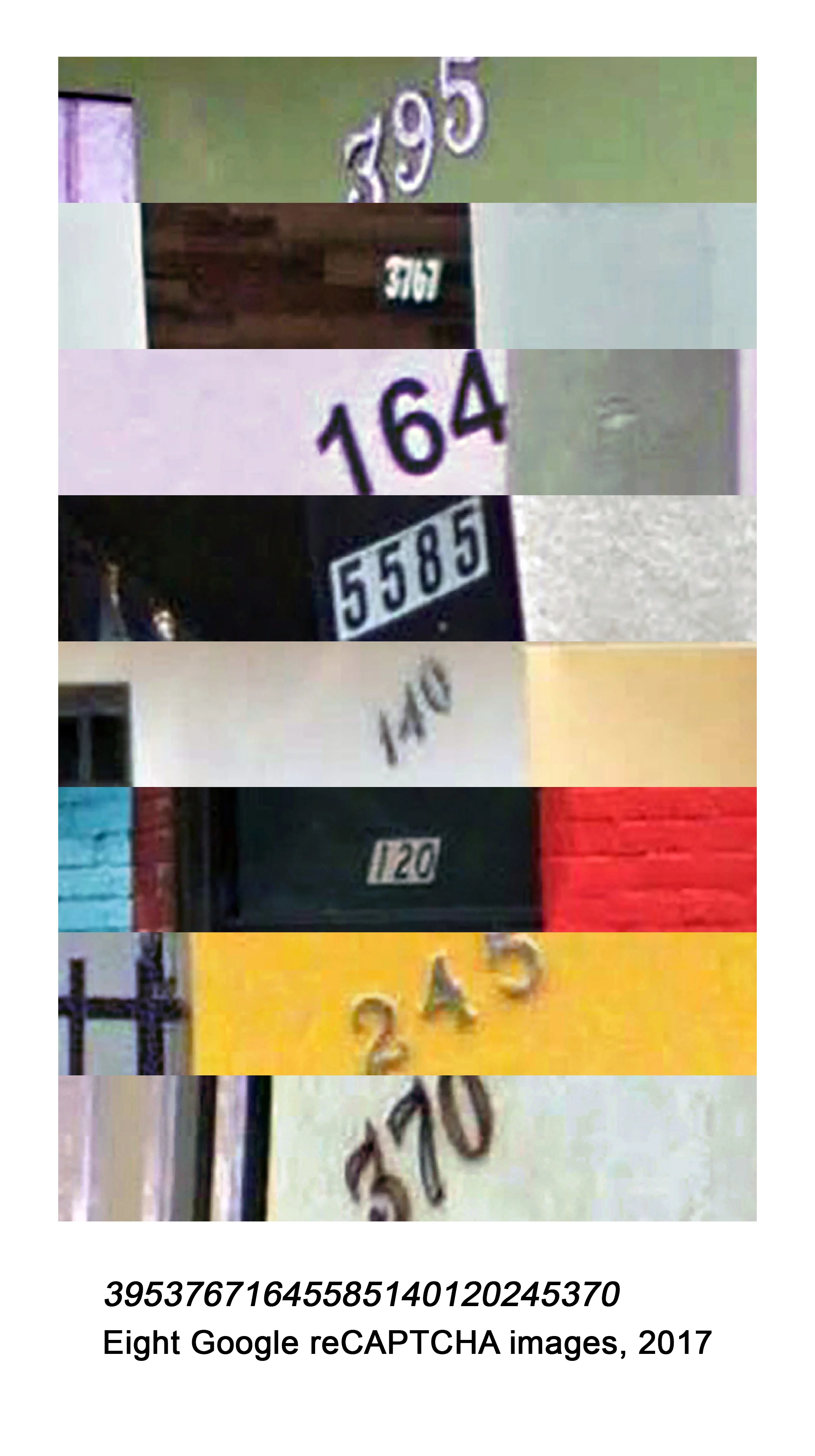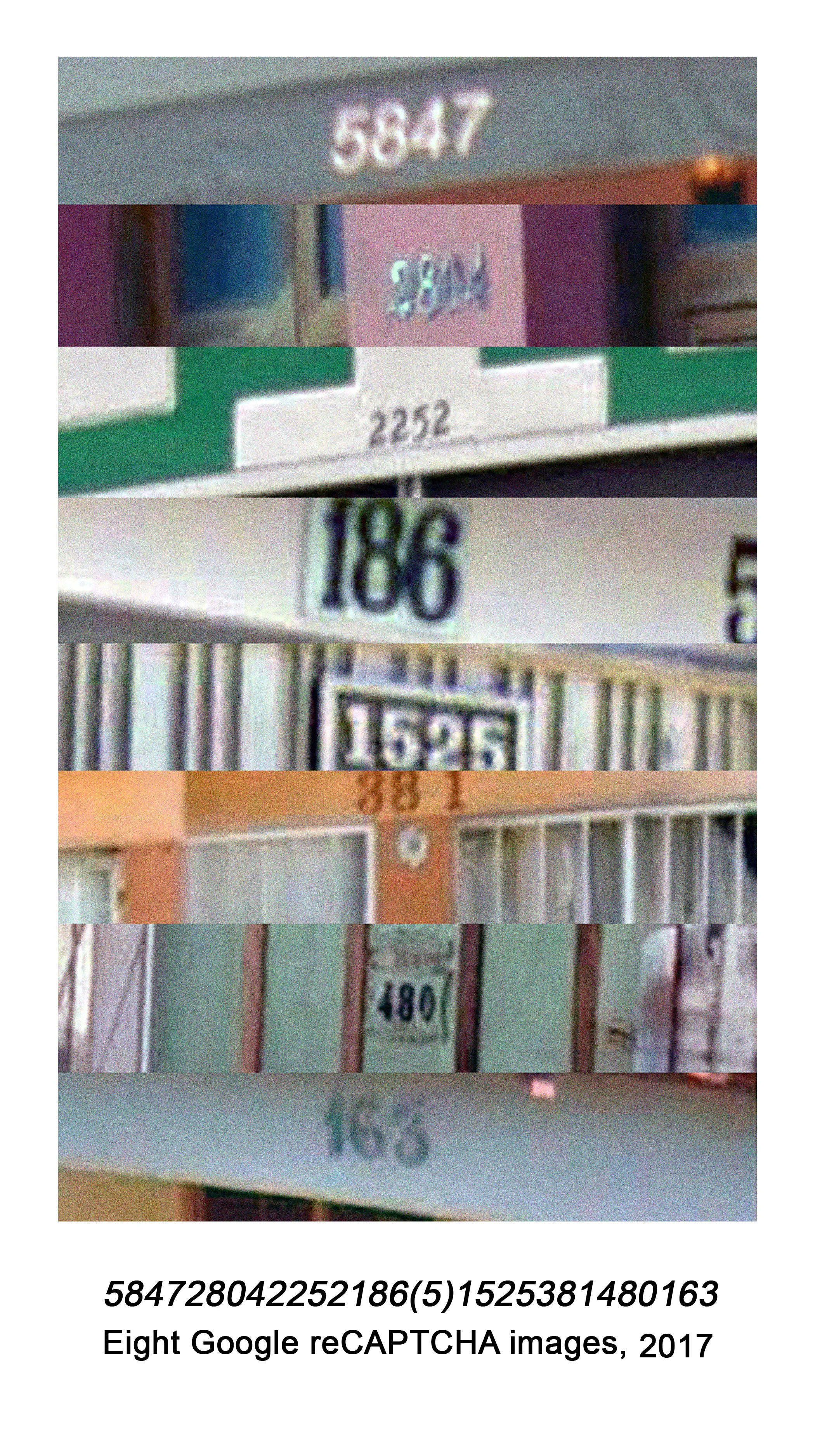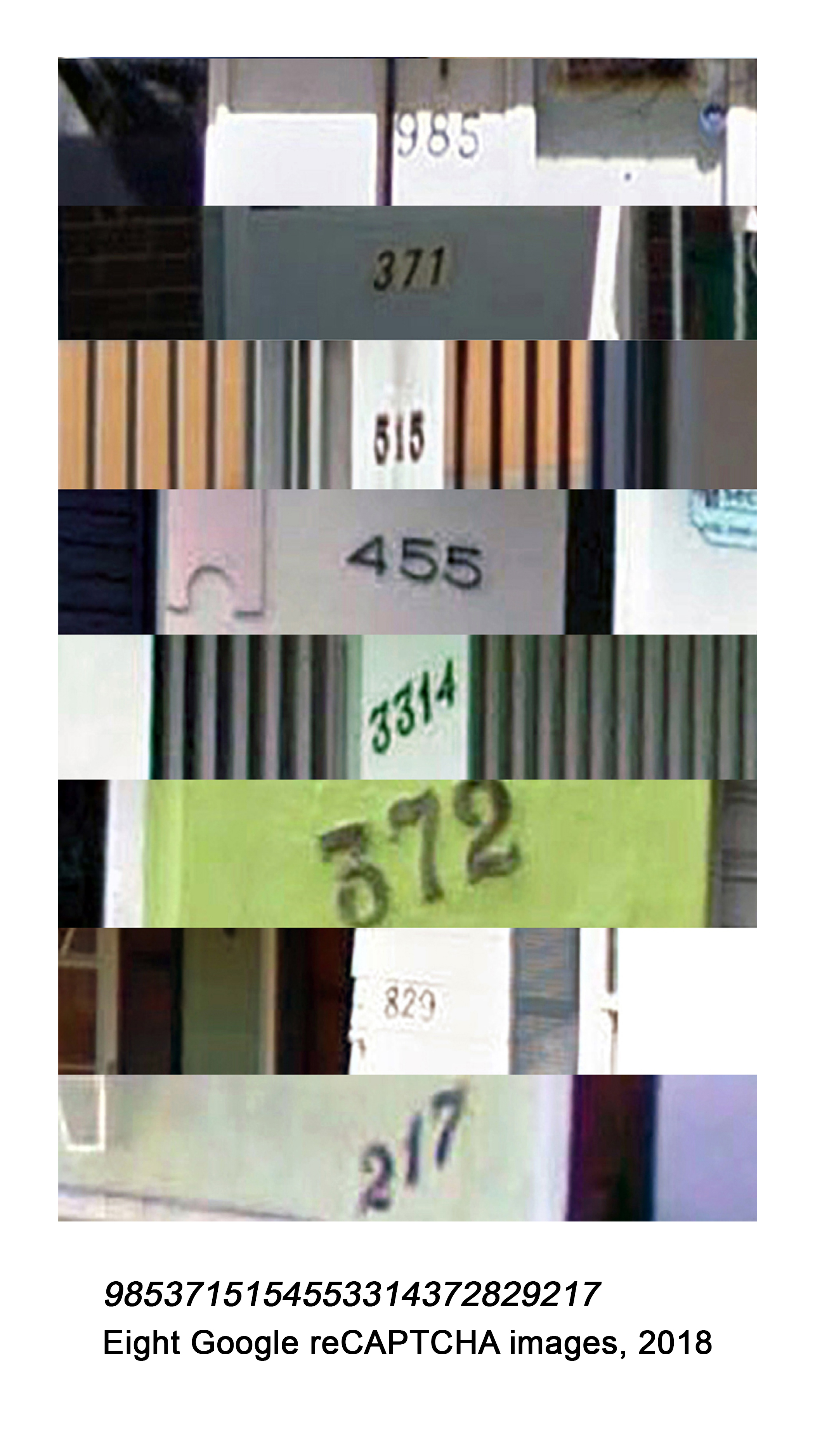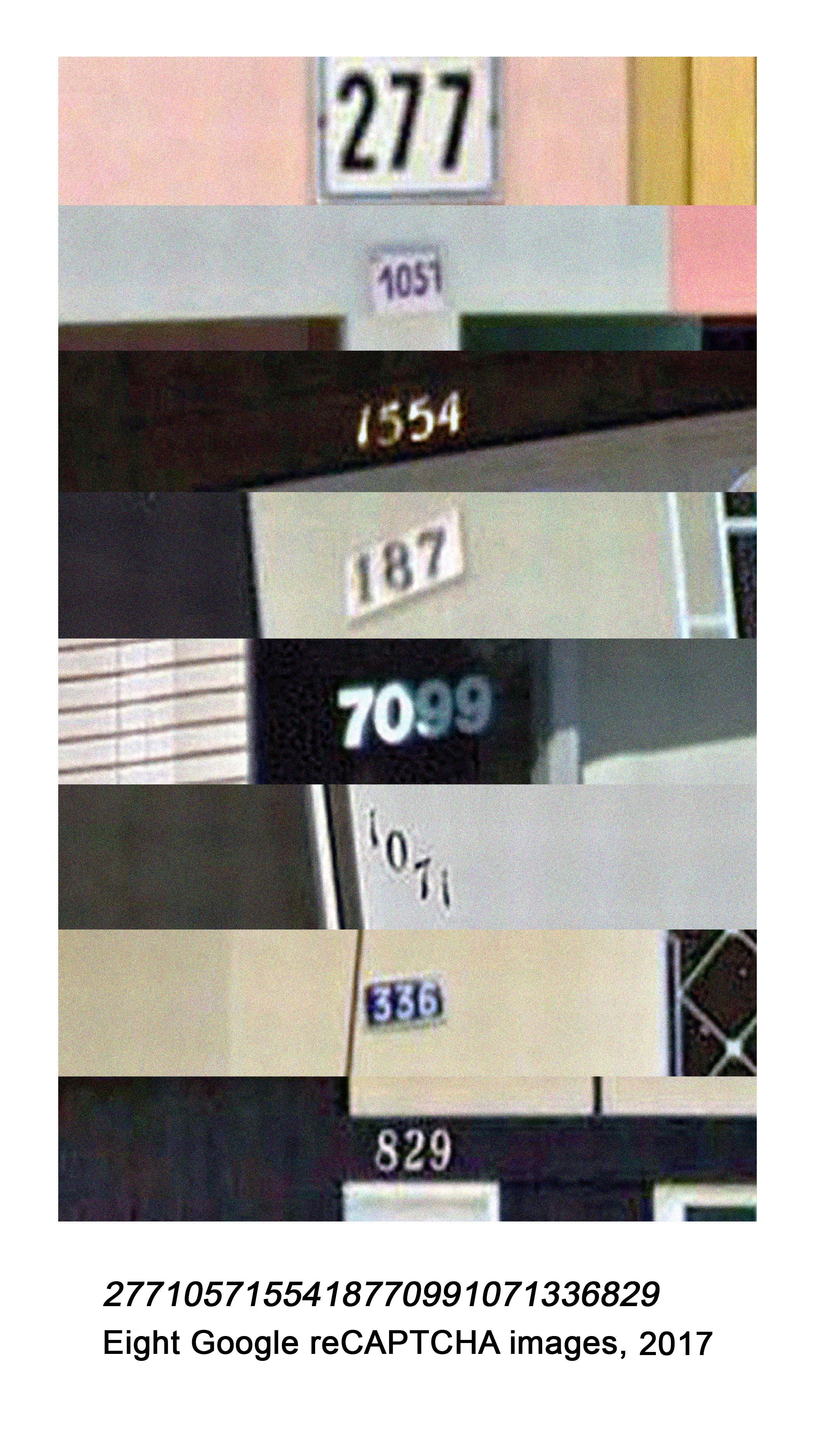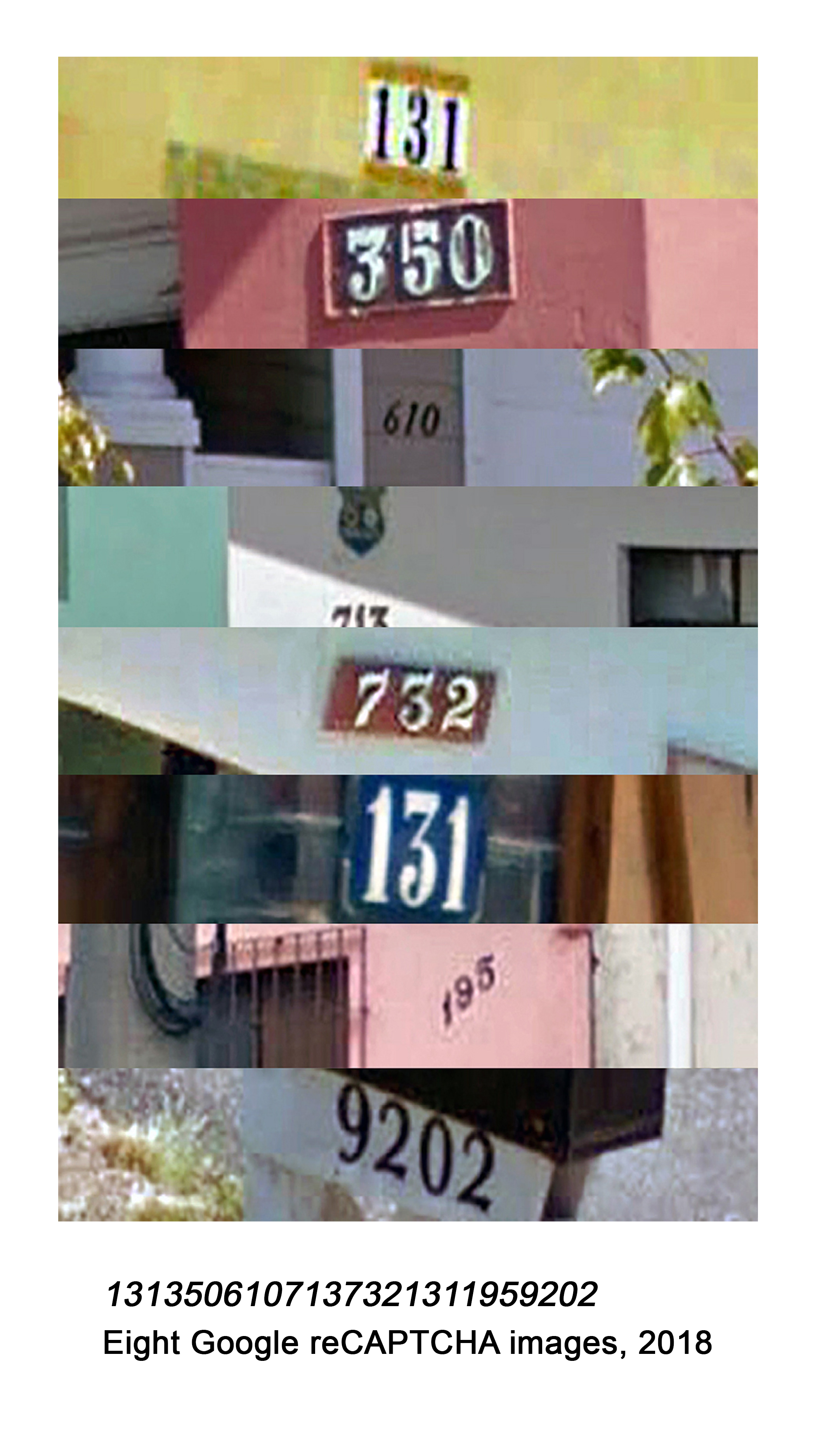 The “reCAPTCHA” system was developed by computer security researchers to prevent bots from exploiting services provided by websites and social media platforms. One usually encountered these tightly cropped, lo-res JPEGs, which were sourced from Google Street View, during the process of creating an online profile. Between May and July of 2016, just prior to an update of the reCAPTCHA system, I had manually downloaded over 2000 reCAPTCHA image files before they all but vanished from the Internet. These ostensibly mundane images performed dual purposes. They functioned concurrently as test challenge pictures in an automated gatekeeping system designed to prevent bots from simulating human agents -- “Prove you’re not a robot” – while also serving as dataset images to develop AI.