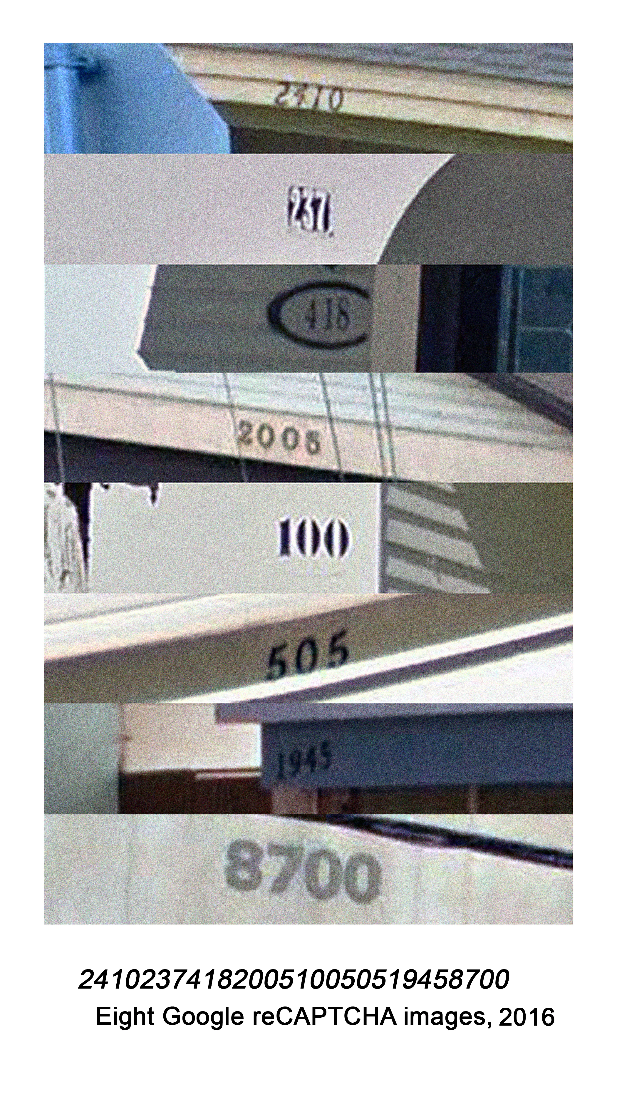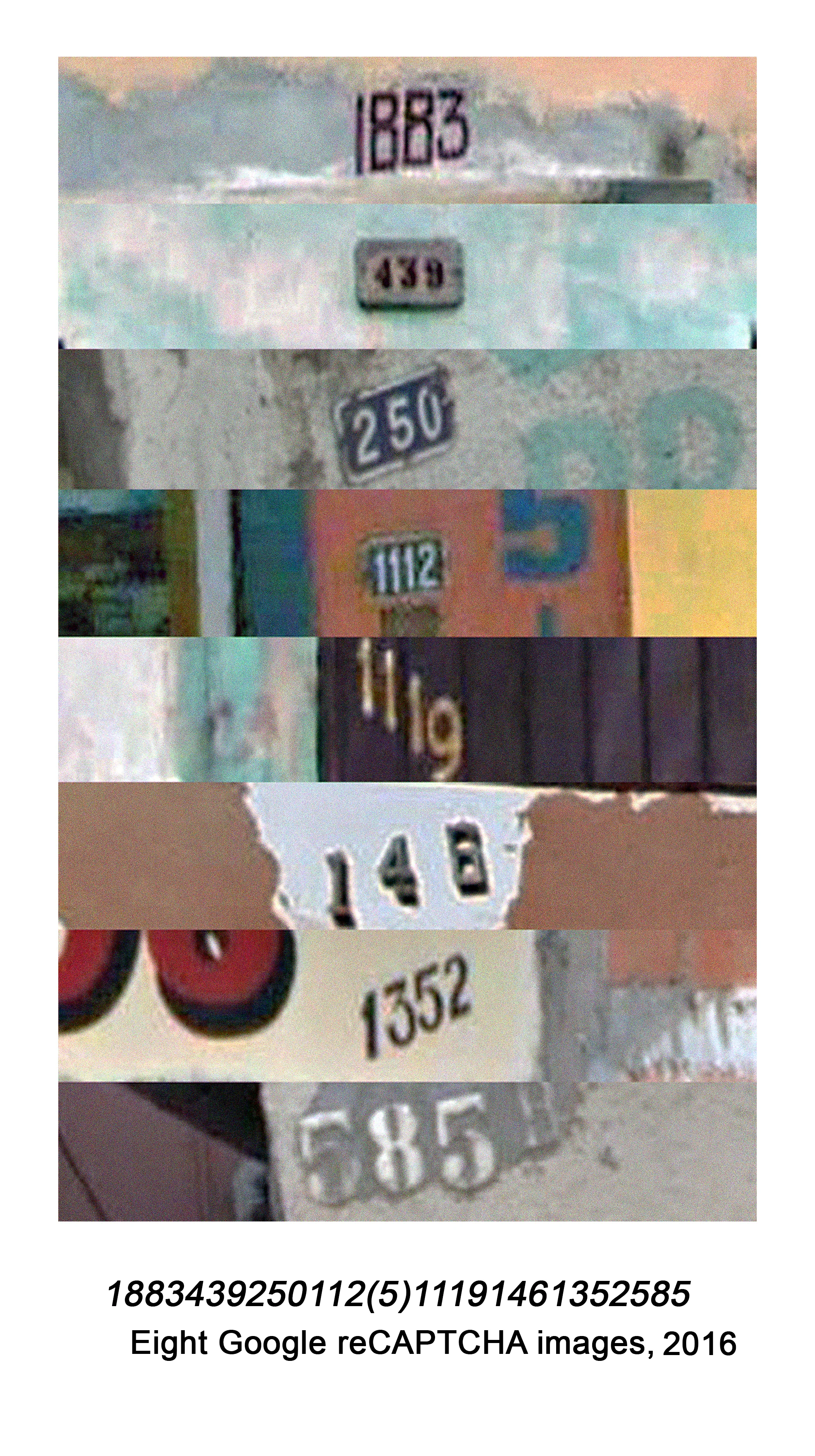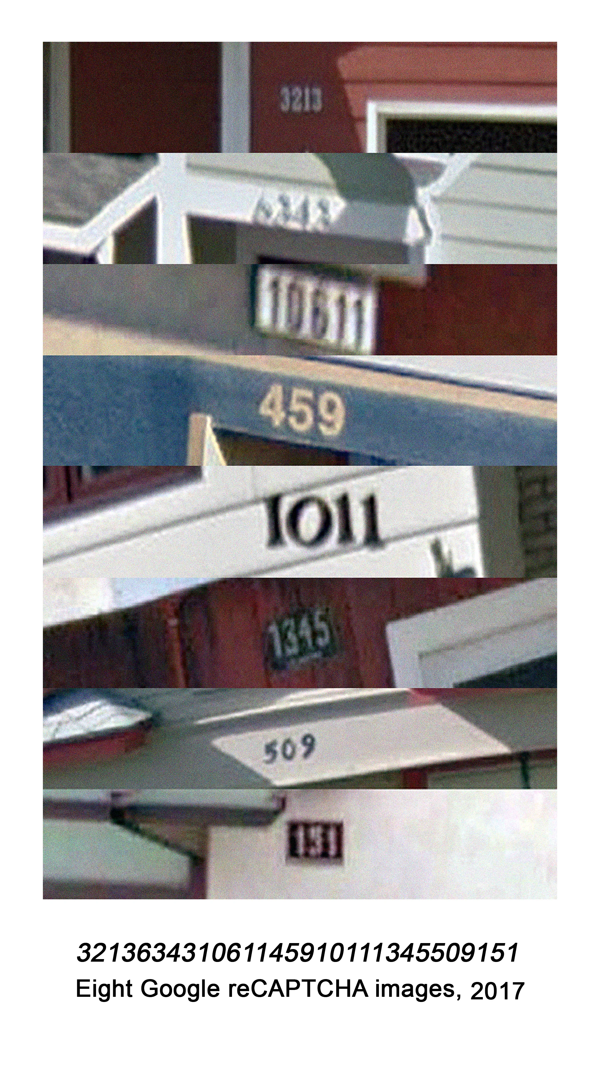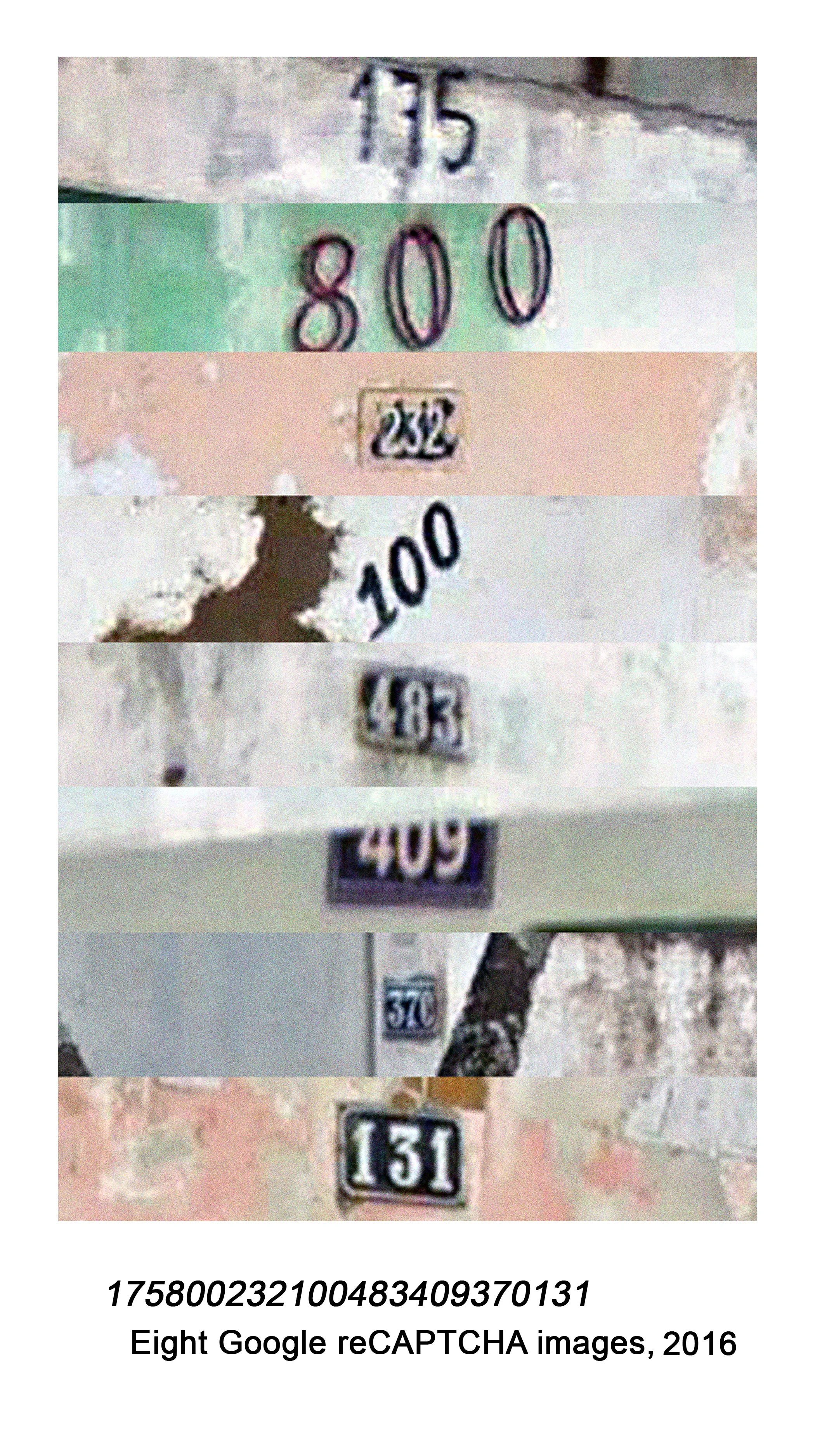 The “reCAPTCHA” system was developed by computer security researchers to prevent bots from exploiting services provided by websites and social media platforms. One usually encountered these tightly cropped, lo-res JPEGs, which were sourced from Google Street View, during the process of creating an online profile. Between May and July of 2016, just prior to an update of the reCAPTCHA system, I had manually downloaded over 2000 reCAPTCHA image files before they all but vanished from the Internet. These ostensibly mundane images performed dual purposes. They functioned concurrently as test challenge pictures in an automated gatekeeping system designed to prevent bots from simulating human agents -- “Prove you’re not a robot” – while also serving as dataset images to develop AI.