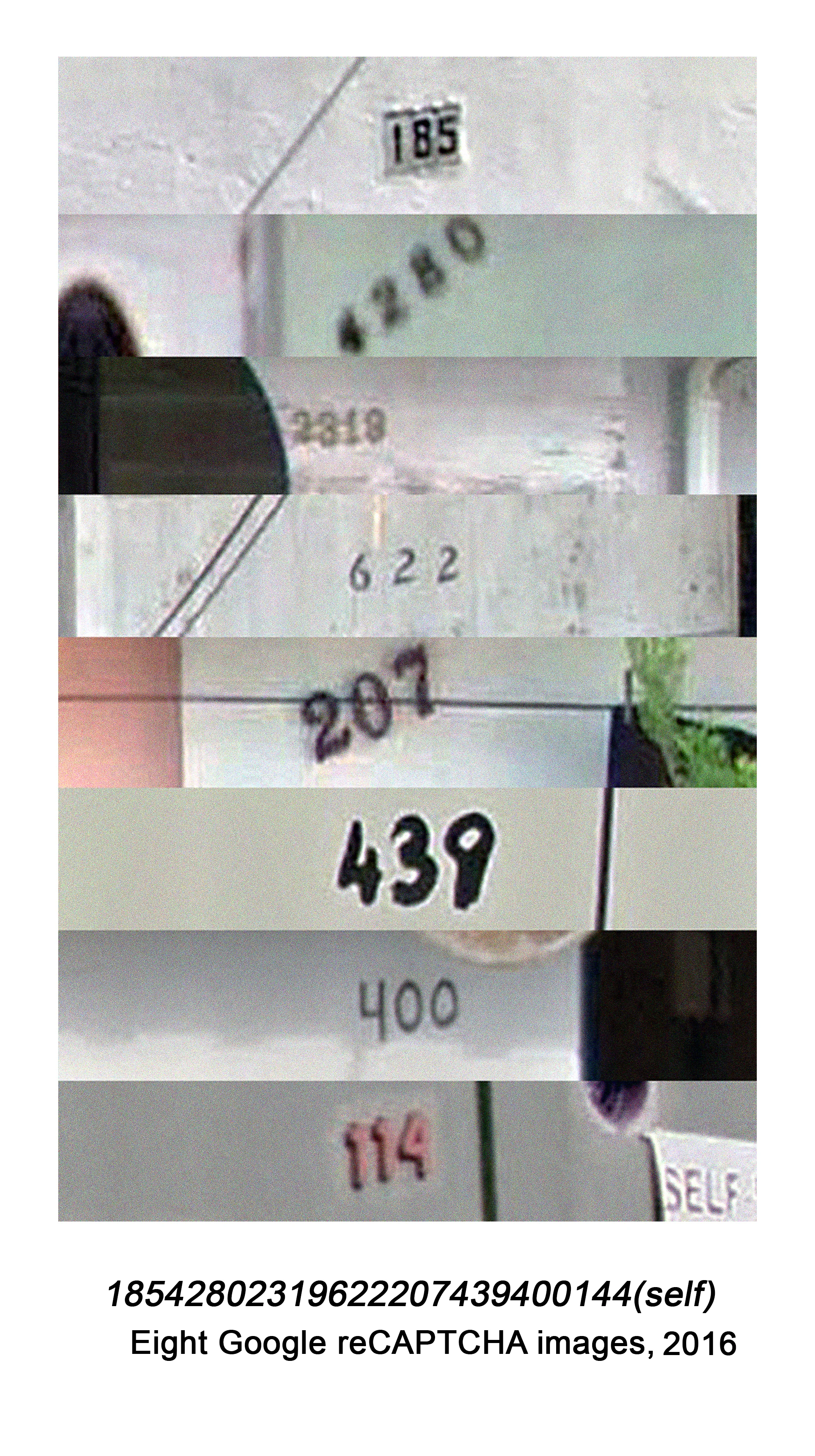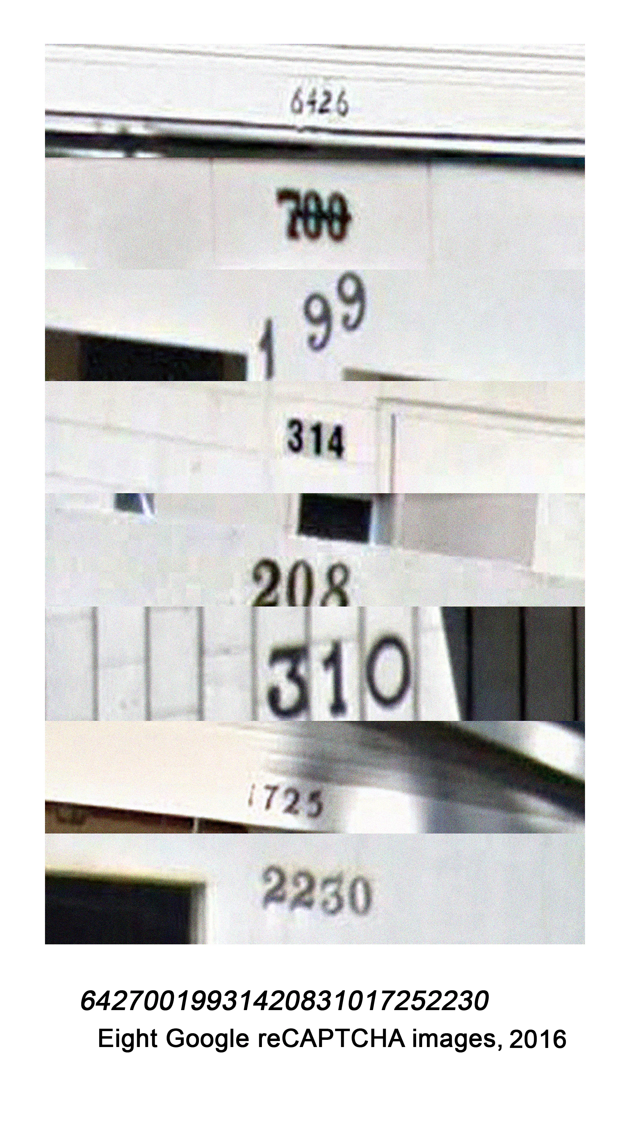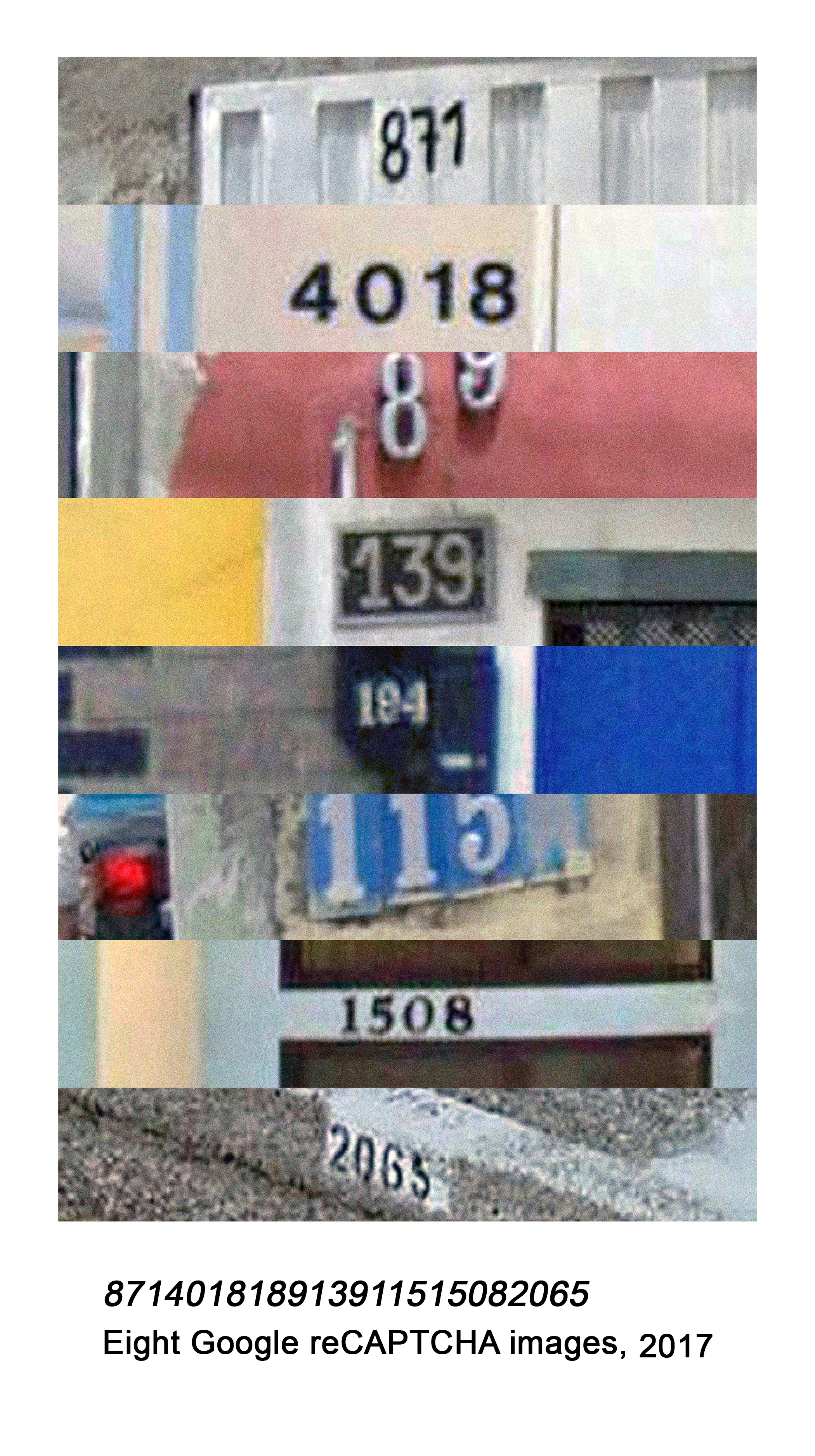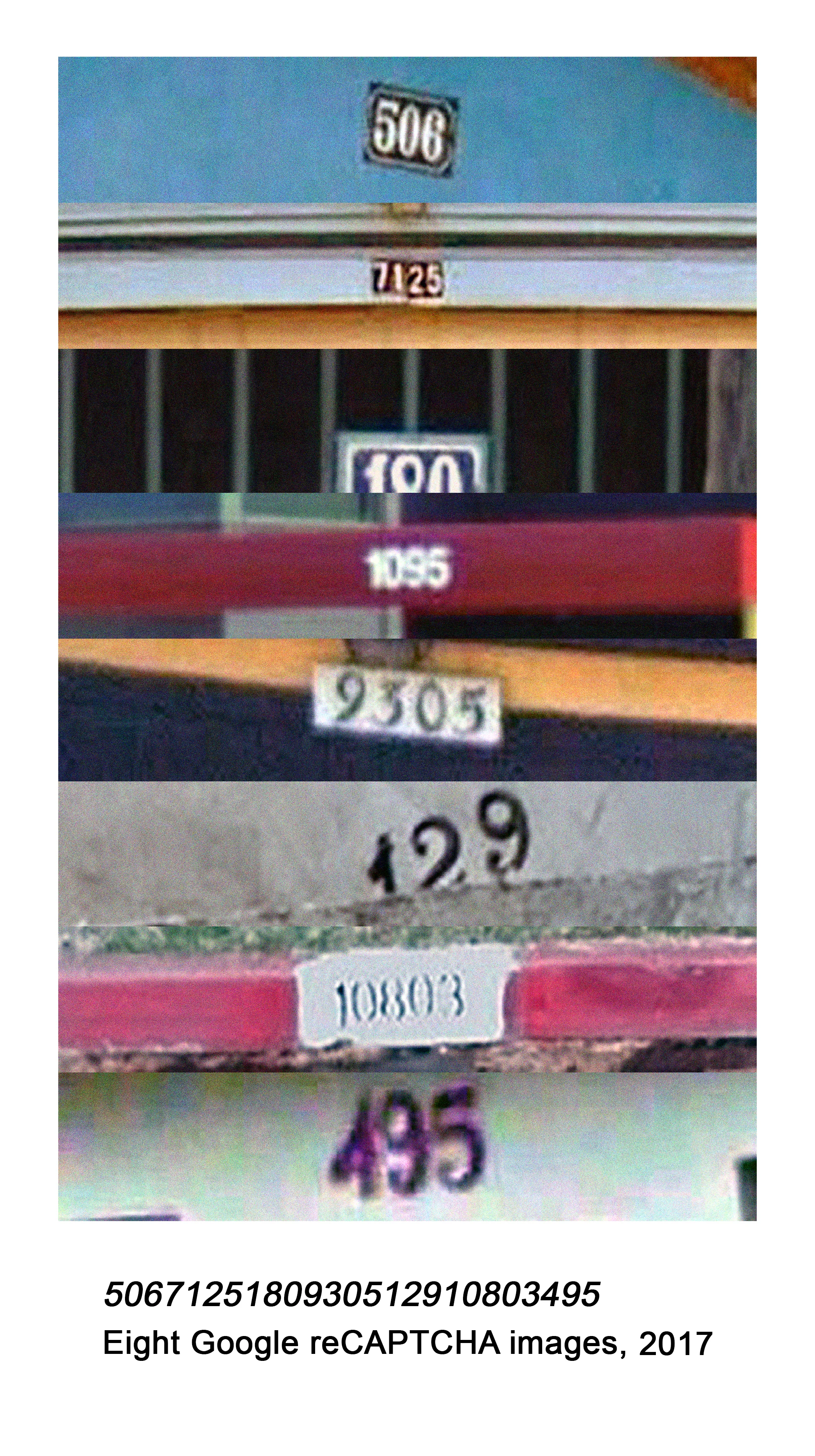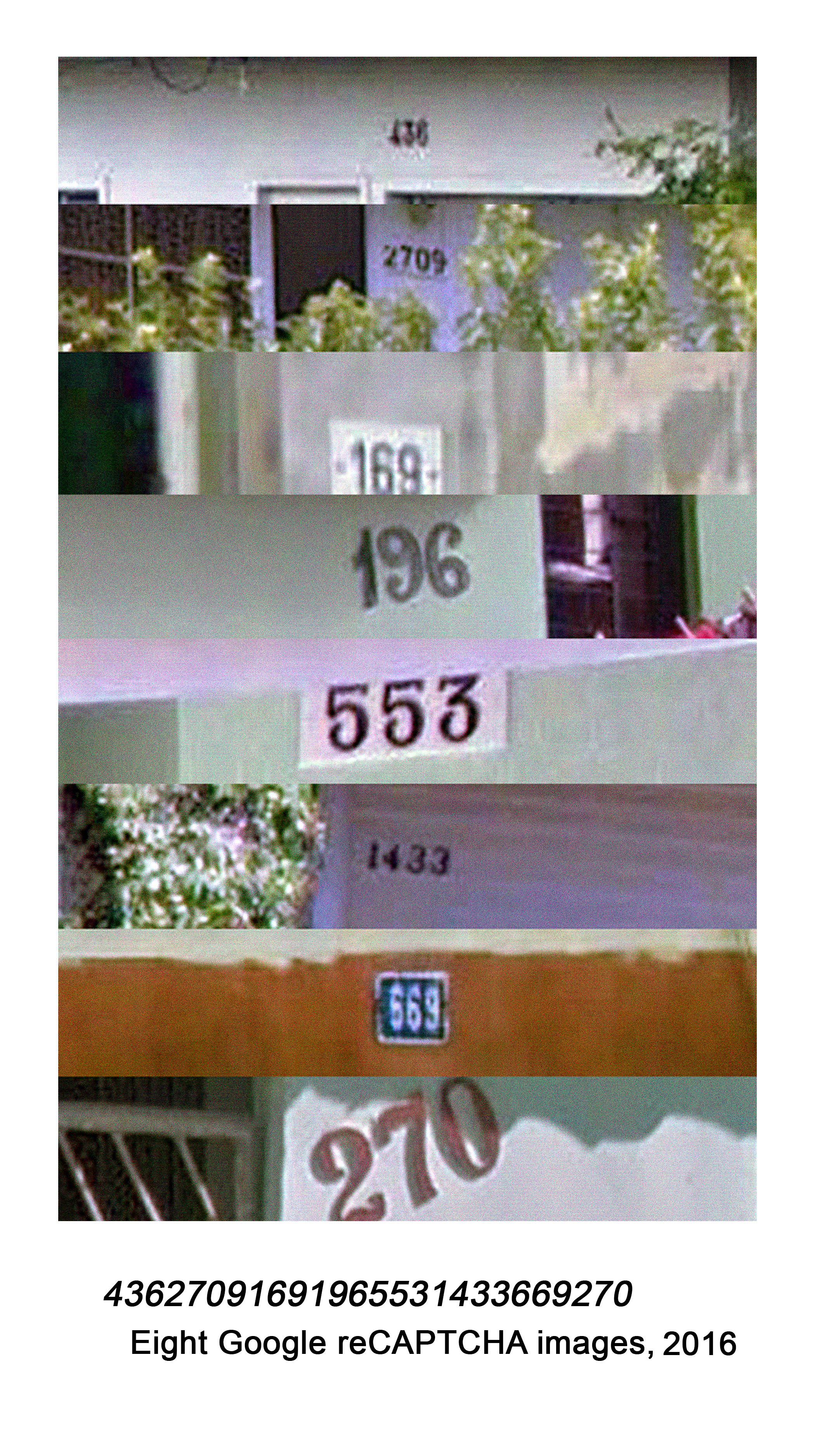 The “reCAPTCHA” system was developed by computer security researchers to prevent bots from exploiting services provided by websites and social media platforms. One usually encountered these tightly cropped, lo-res JPEGs, which were sourced from Google Street View, during the process of creating an online profile. Between May and July of 2016, just prior to an update of the reCAPTCHA system, I had manually downloaded over 2000 reCAPTCHA image files before they all but vanished from the Internet. These ostensibly mundane images performed dual purposes. They functioned concurrently as test challenge pictures in an automated gatekeeping system designed to prevent bots from simulating human agents -- “Prove you’re not a robot” – while also serving as dataset images to develop AI.
